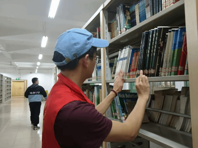活动开始前,志愿者们到达图书馆门口集合,集合完毕后,由各小组组长分发志愿者服装,并带领组员前往指定楼层区域开展图书馆清洁工作,主要包括站岗、图书整理、书架清理等。