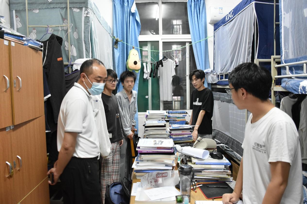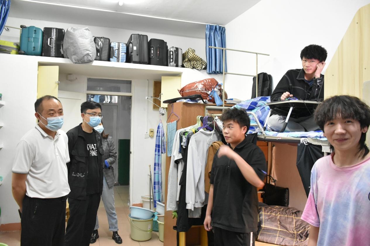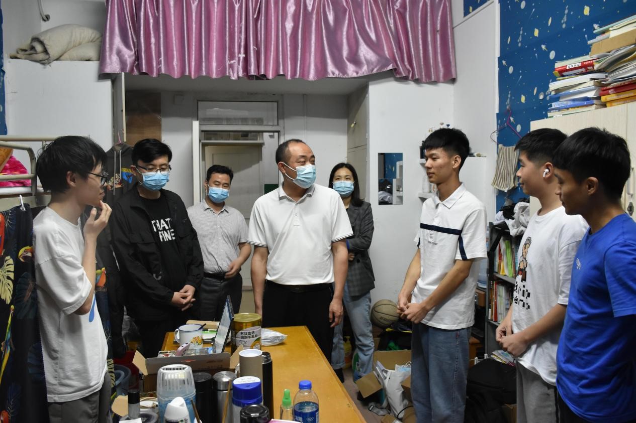 为深入了解疫情防控期间学生生活情况和身心状态,5月8日晚,九游体育官方网站院长汤明、党委副书记张杨帆、学生思政教育科副科长肖国光、学生管理科科长龚双双等相关科室负责人深入学生宿舍走访,与学生进行亲切交谈,倾听学生心声,解决学生诉求。