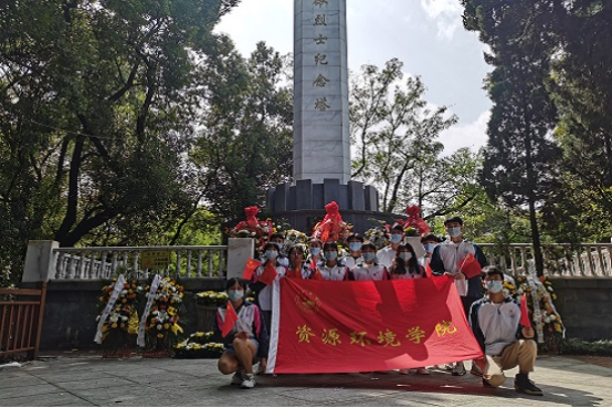 烈士陵园松柏长青,巍峨的烈士纪念碑庄严矗立,碑正面“革命烈士纪念塔”七个大字刚劲有力、熠熠生辉。上午10时许,主持人宣布向人民英雄敬献花篮仪式正式开始,全场肃立。革命先烈为之奋斗、牺牲的伟大事业,一代代,生生不息,薪火相传。两位同学将花篮摆放在纪念塔前面,花篮寄托着资环学子对革命先烈和人民英雄的无限哀思、崇高敬意。接着,参加仪式的学生干部代表排着整齐的队列,庄严肃穆地向烈士行鞠躬礼并默哀三分钟,随后依次瞻仰烈士纪念碑和烈士英名墙,悼念追思英雄烈士。仪式最后,全体学生重温入团誓词,向革命先烈致以资环学子崇高敬意。
