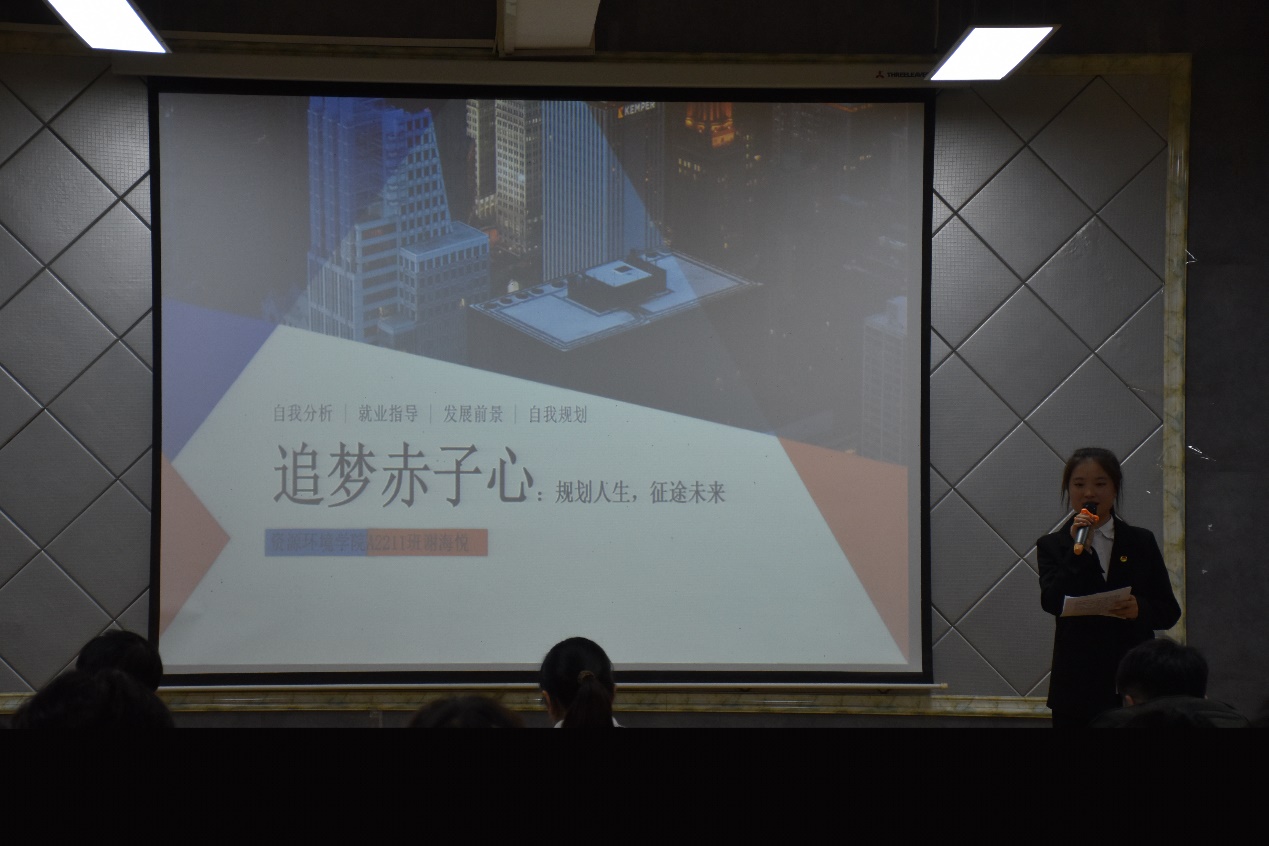 学院参照省赛评分标准对参赛选手的书面材料初步进行评选,根据得分高低确定作品前15件进入第二轮路演评审。路演过程中,选手们通过八分钟精彩主题陈述和PPT 展示,向评委和观众详细阐述了自己的职业生涯规划,其中包括自我认知、职业目标、发展路径、行动计划等方面。