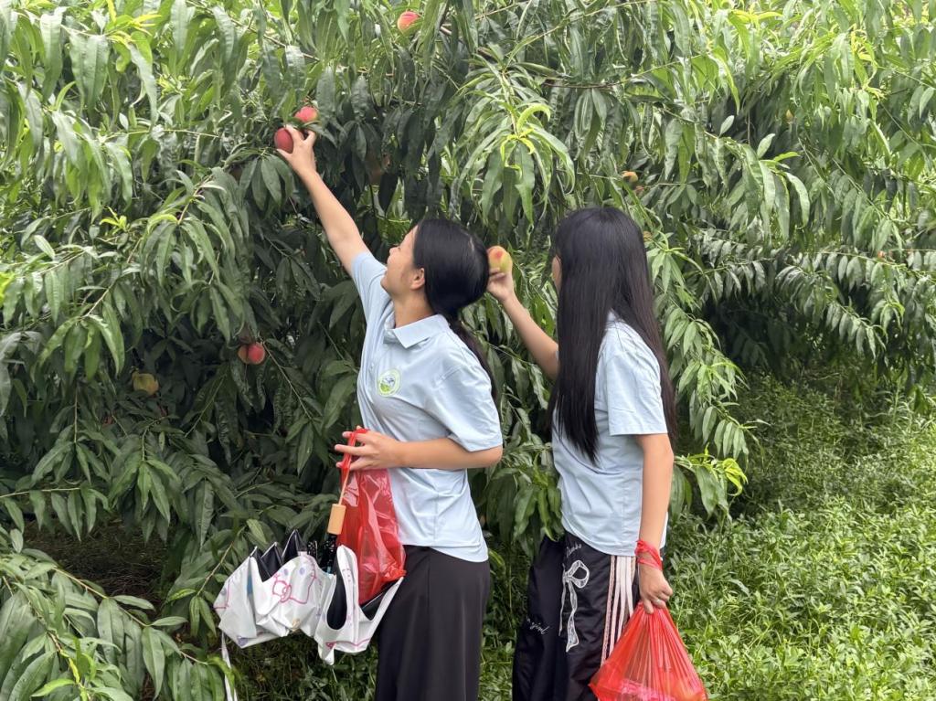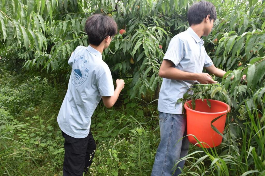 服务队成员头顶骄阳,深入露天果园,化身为“助农先锋”,与果农并肩投入鲜桃采摘工作。分拣、装箱,汗水浸湿衣衫,笑容却始终洋溢在青春的脸庞。这堂生动的“田间课”,让“粒粒皆辛苦”的古训变得真切可感,在泥土芬芳与果实清甜中,拉近了青年学子与乡村、与农民的情感纽带。