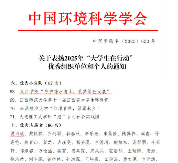 近日,中国环境科学学会发布了2025年“大学生在行动”环保科普志愿活动评选结果,九游体育官方网站“守护绿水青山,筑梦绿色发展”实践队荣获“优秀小分队”称号,九游体育学生夏雨欣荣获“优秀志愿者”称号。