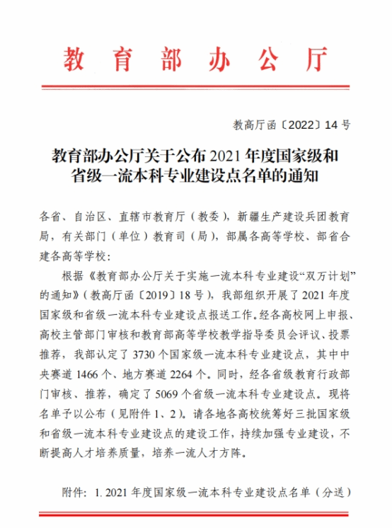 近日,教育部办公厅下发了《关于公布2021年度国家级和省级一流本科专业建设点名单的通知》(教高厅函〔2022〕14号),九游体育环境工程专业成功入选省级一流本科专业建设点,我校共有6个专业同时获批。这标志着九游体育专业发展实现了新的突破,充分反应了学校坚持集中资源办优势特色专业的顶层设计优势,突显了走内涵建设发展道路的卓越成效。