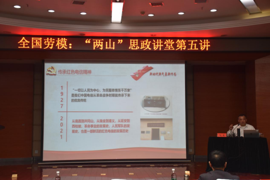 向东用微电影的方式向大家展示了自己是如何从一名普通机线员到三届全国党代表的过程,以《传承红色基因书写劳模时代荣光》为题,从“平凡劳动就是要脚踏实地工作,用奋斗成就事业梦、创新劳动就是要不断努力出新出彩,用勤奋实现效率梦、诚实劳动就是要心怀感恩真情奉献,用爱心共筑和谐梦、勤勉劳动就是要深入基层联系群众,用真情共圆中国梦!”角度讲述了自己的成长经历和心路历程;向东还分享了六点人生体会与所有同学共勉:不断给自己设定目标,要有永不放弃的精神,坚持快乐的心态,养成持续学习的习惯,永远坚持心中的善良,不断完善持续改进。