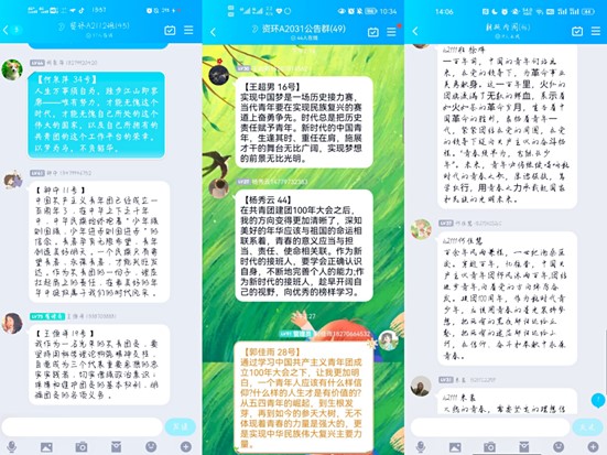 资环学院A2121班学生曹嘉玮:习近平总书记曾说过,“只有把小我融入大我,才会有海一样的胸怀、山一样的崇高。” 我们要把个人的成长与国家发展紧密联系在一起,担负起对祖国的责任和义务,要听从党的指挥,始终跟党走,坚定理想信念,用青春的能动力和创造力激荡起民族复兴的澎湃春潮,用智慧和汗水打拼出一个更加美好的中国!