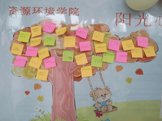 健康和谐的心理是大学生健康成长成才的前提和关键,为营造浓厚的心理健康教育氛围,促进身心健全发展,资环学院围绕自我发展、人际交往、学习生活、情绪管理、危机预防等各方面深入开展心理健康知识的宣传及普及,同时学院充分整合网络资源,组织学生观看高校“心理云课堂”公益直播课和心理健康知识科普宣讲活动。学院此次心理知识普及教育涉及范围广、种类丰富繁多,全院同学在学习中深刻掌握心理健康知识的同时也是一个与自身心灵解疑答惑的过程。与此同时学院特设"解忧杂货铺"(心理树),让同学们抒发内心的精彩与烦闷,讲述自己的心灵历程,相互鼓励成长。